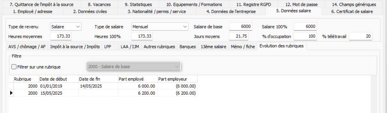 The information is to be entered in tab 5 of the employee management under "Item evolution":