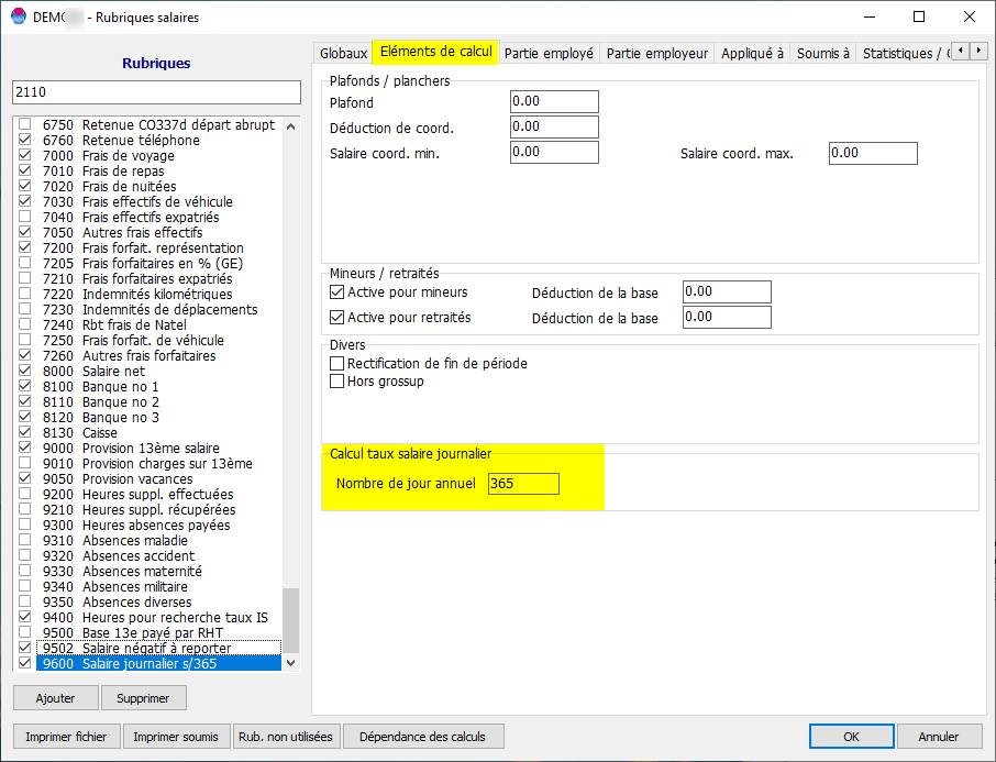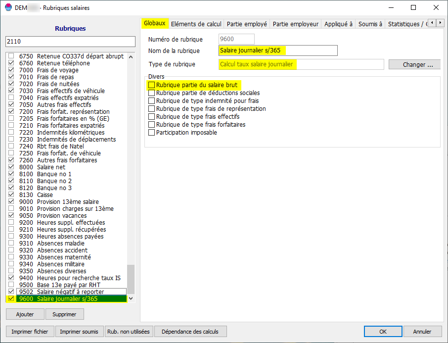 Create item code 9600, enter the name in the first tab, and select the item code type "Calculate daily salary rate".
