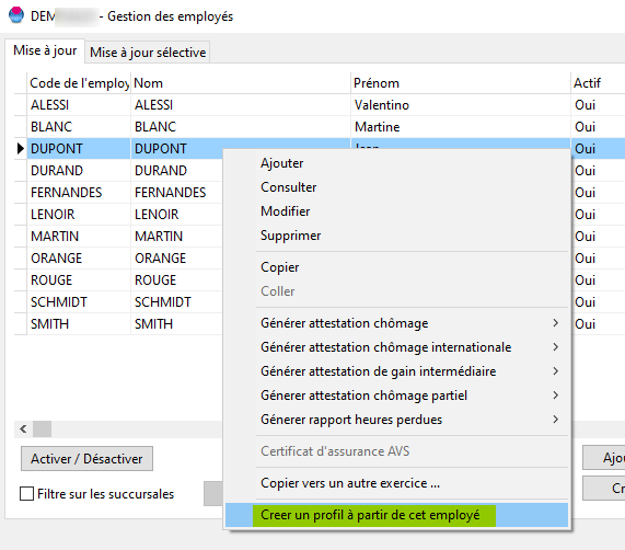 Il est possible de créer des profils sur la base d'employés existants en faisant un clic droit sur un employé et "Créer un profil à partir de cet employé".