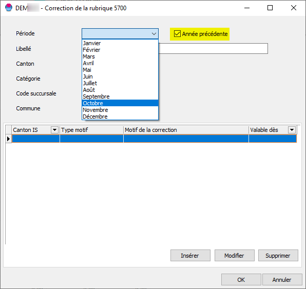 Il est possible également de saisir une correction sur une période de l'année précédente. Cette option "Année précédente" apparait uniquement sur les mois de janvier à mars. Dès le mois d'avril, il n'est plus possible d'effectuer de correction sur l'année précédente.